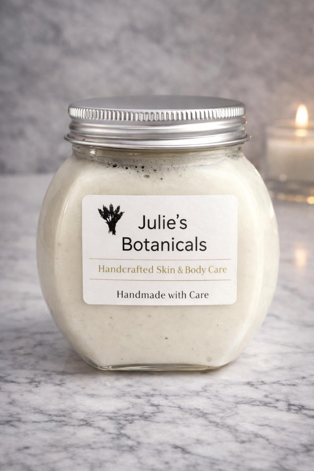 Silky Emulsified Sugar Scrub – [Black Raspberry Vanilla] – Luxe Body Exfoliant & In-Shower Moisturizer Product Description: Transform your shower into a spa experience. Say goodbye to messy, oily scrubs that leave your tub slippery and your skin greasy. Our Luxe Hybrid Emulsified Sugar Scrub is a high-performance exfoliant that does more than just scrub. When mixed with water, this scrub transforms into a creamy, lotion-like milk that rinses away cleanly, leaving your skin velvety-soft, hydrated, and glowing. ✨ The Experience: • The Texture: A thick, scoopable balm that stays on your skin (not the shower floor). • The Feel: Infused with Cetyl Alcohol for a high-end, silky "slip" and Shea Butter for deep nourishment. • The Result: Smooth, polished skin with zero greasy residue. Perfect for prepping before shaving or self-tanning