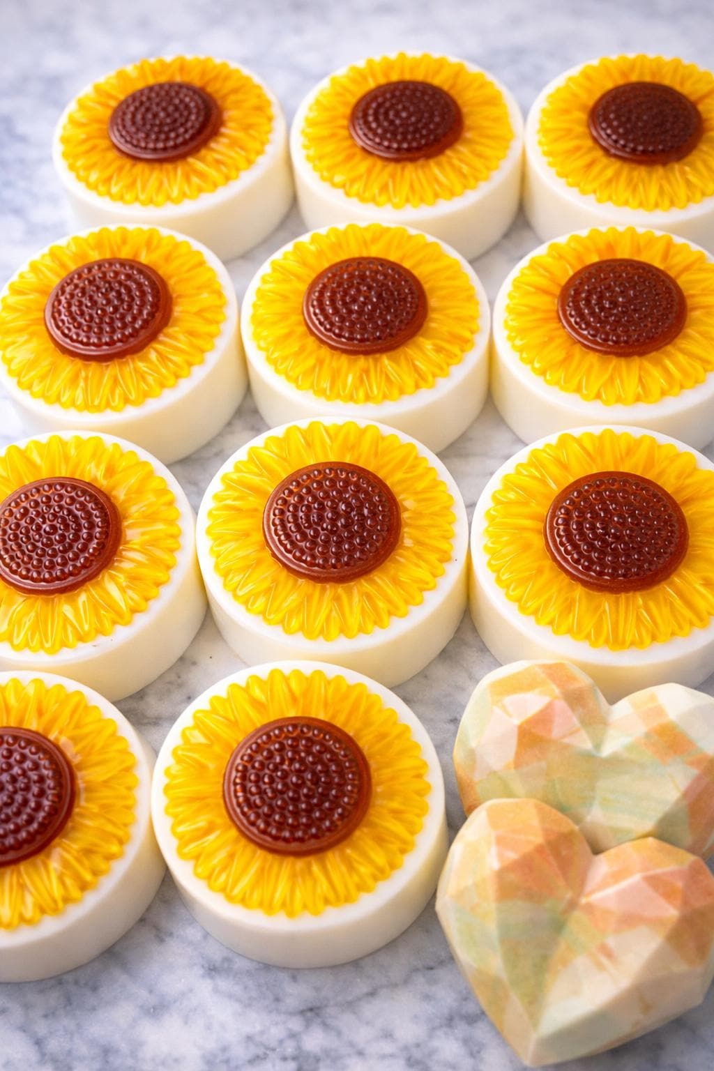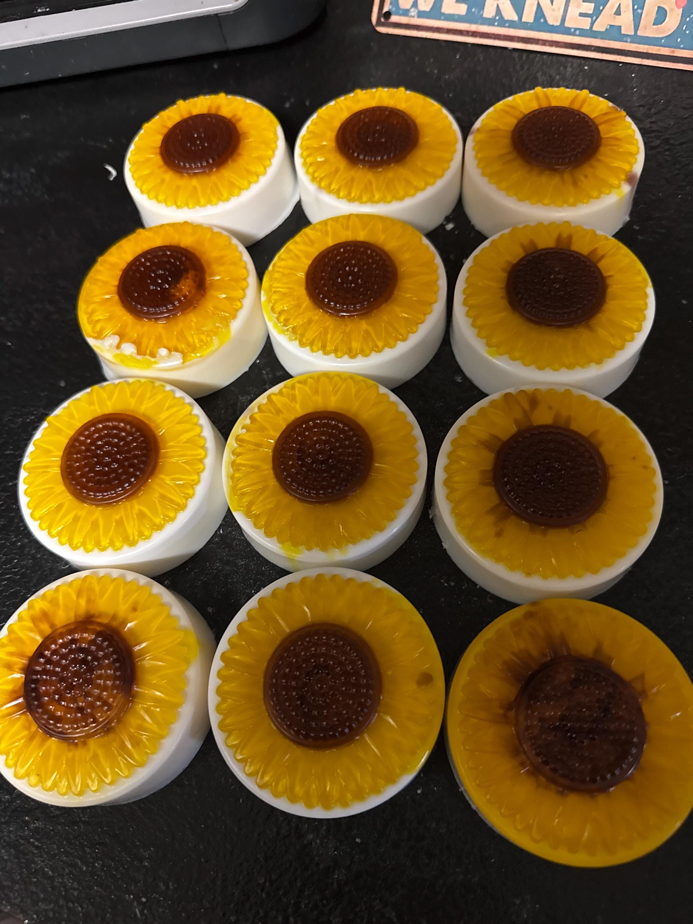 Each bar features a radiant golden sunflower top with a rich brown center, resting on a smooth creamy white base. It’s cheerful on the outside… and beautifully sophisticated on the inside.